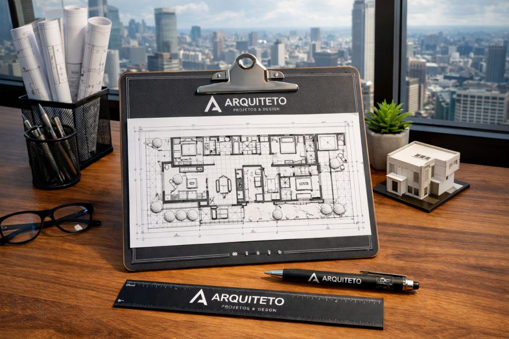 Além disso, a personalização do kit pode incluir o nome do profissional ou a identidade visual do escritório de arquitetura.