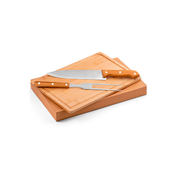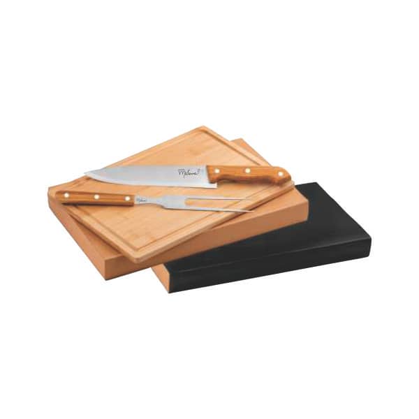 Kit Churrasco 3 Peças Personalizado, disponível em caixa para presente. Produto aliado do meio ambiente, é também fabricado com material de mais alta qualidade. As facas e garfos são feitos de aço inox e a tábua de bambu.