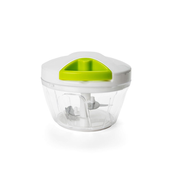 Processador de Alimentos Personalizados, possui tampa plástica de polipropileno branco com puxador verde, pote transparente em poliestireno com relevo e lâminas em aço inox. Brinde ideal para feiras e eventos da indústria alimentícia, conta com ampla área para personalização de logomarca.